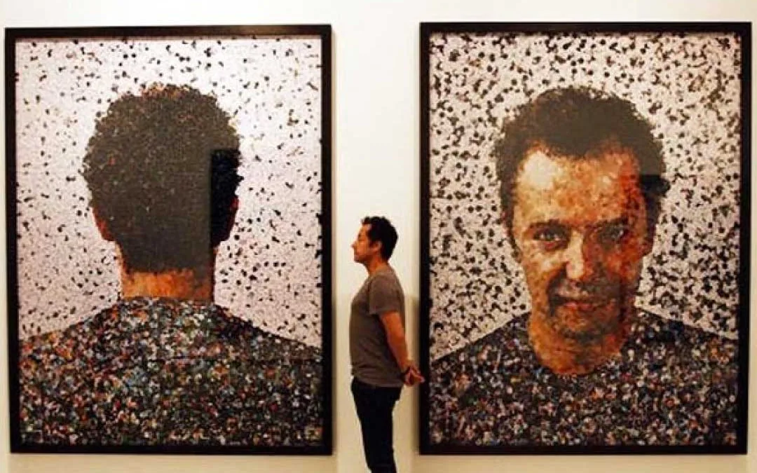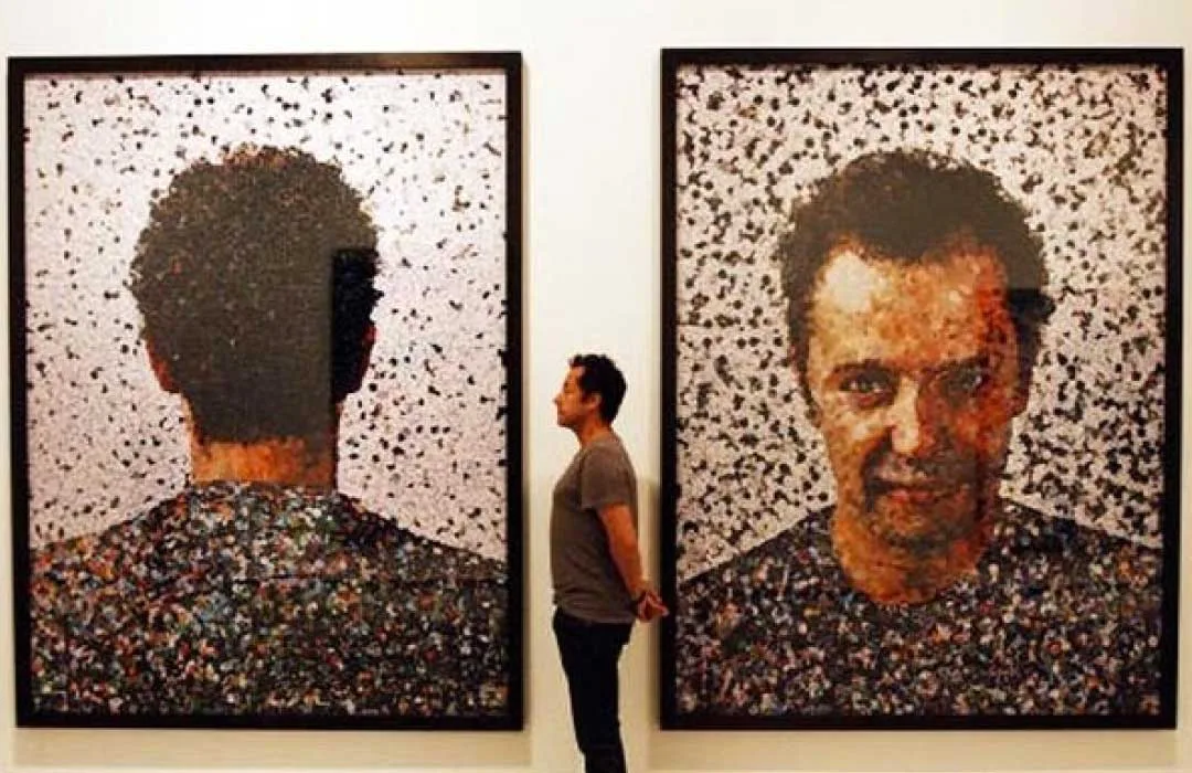 O artista brasileiro Vik Muniz no meio de dois autorretratos criados com papel recortados de revistas